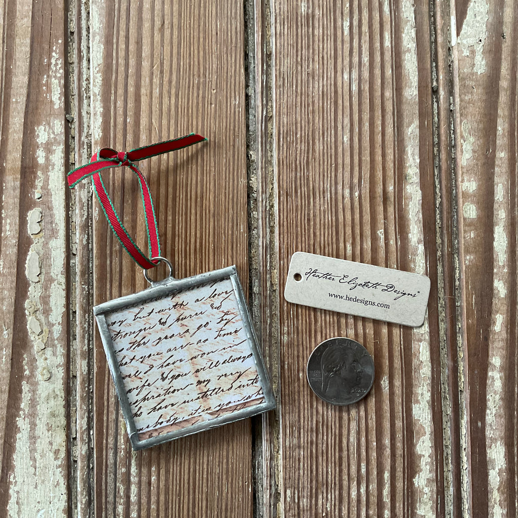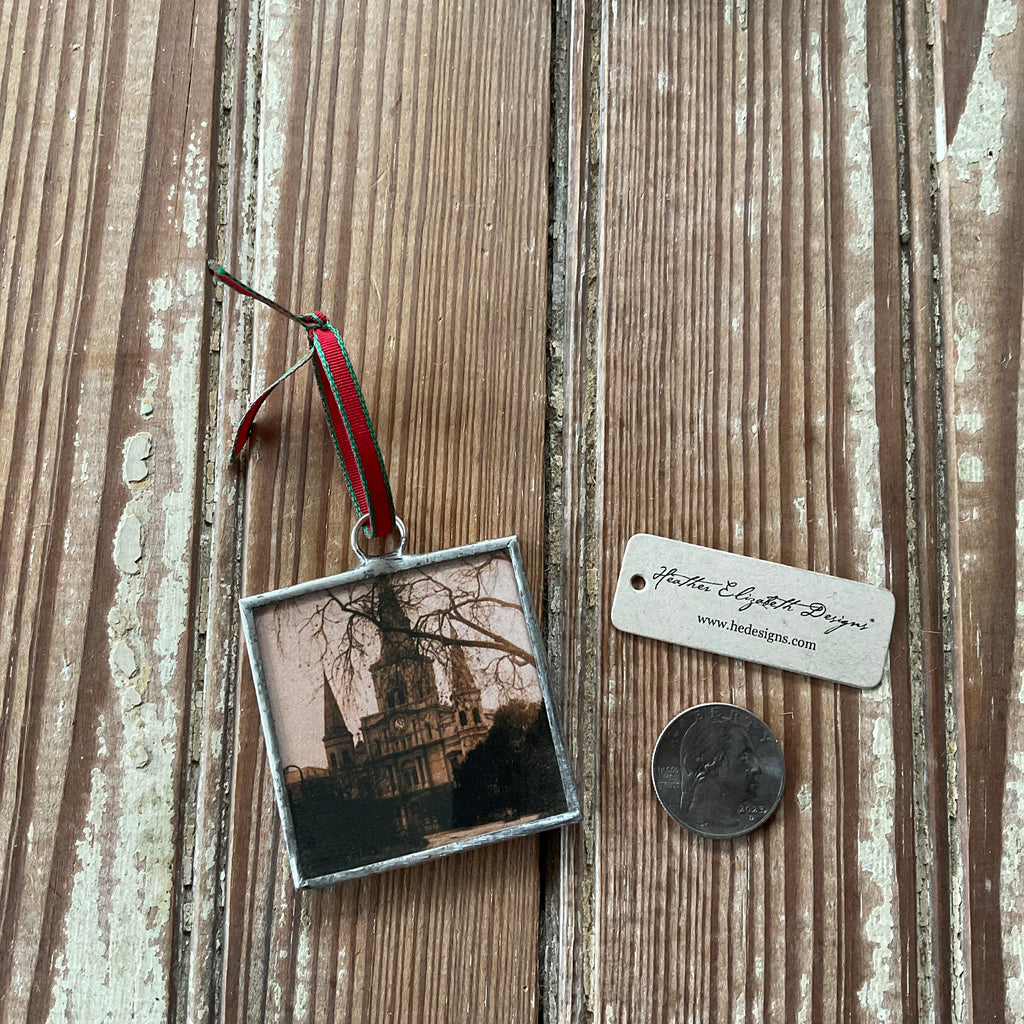 Hand soldered glass St. Louis Cathedral ornament. Reverse is a snippet of my ancestor’s love letter. Measures 2” x 2”. Double sided with imagery as shown in photo.